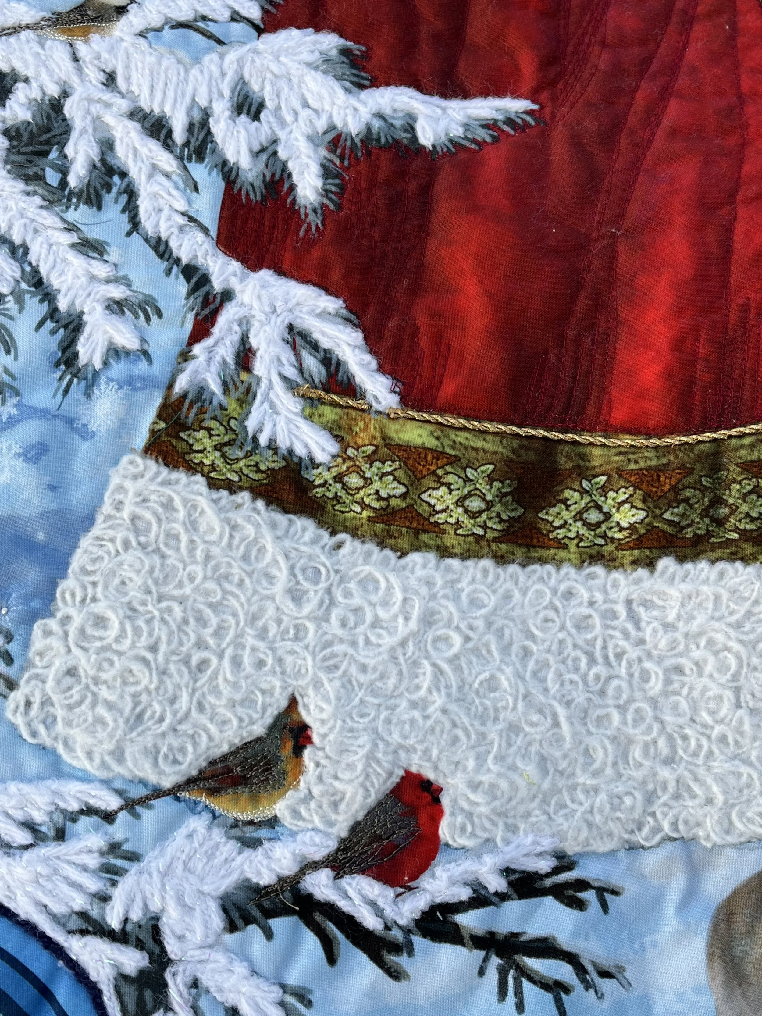 This St. Nick is beautiful just as he is but I grabbed my bin of yarn and my free-motion couching foot and I gave him a little texture in his fur.